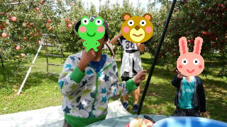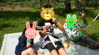 嬉しそうにリンゴをもぎ取り、お口いっぱいにリンゴを頬張っていました。