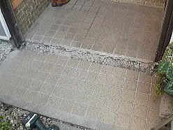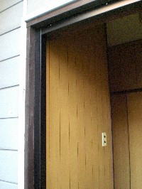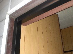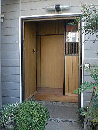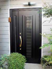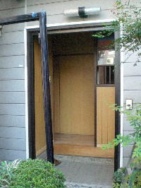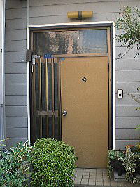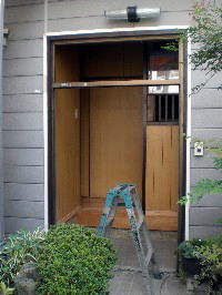 □施工内容□ 09.10.29 建物と共に玄関が傾き開閉が悪くなったためガバー工法で取り替えました。 改修前 改修後 初めにドアとランマのガラスを外します。 下枠を外し土間をハツリます。 予め計算して作っておいたアルミ曲げ物を取り付けます。