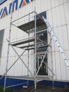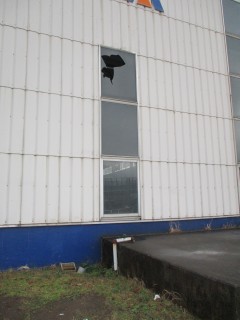 高所作業のガラス割れ替えのため、足場を組んで割れ替え作業をしました。